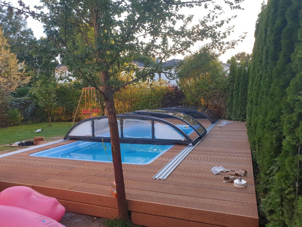 Poolterrasse Bangkirai glatt mit Sichtschutzelementen
